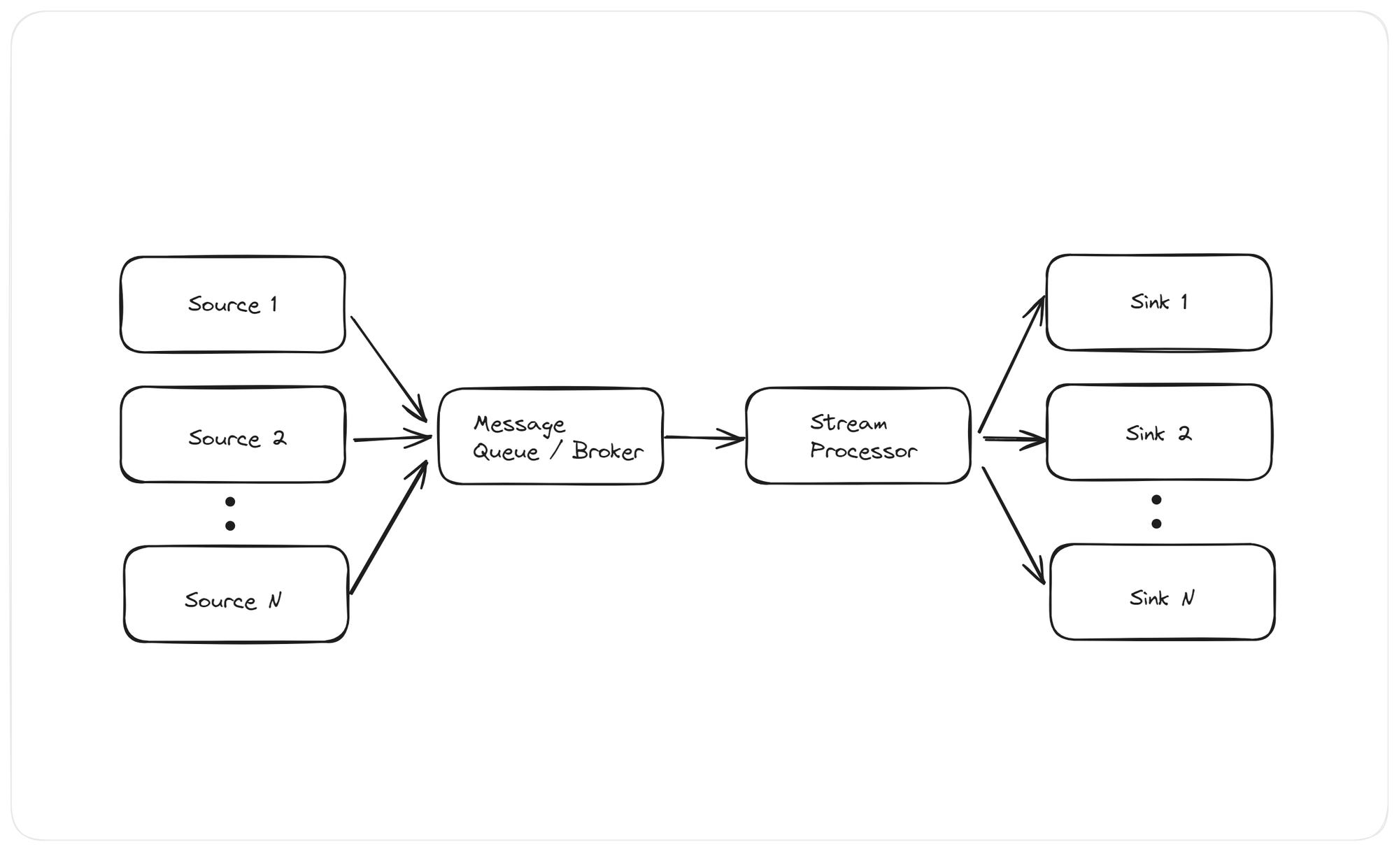 Source(s) -> Message Queue/Broker -> Stream Processor -> Sink(s)