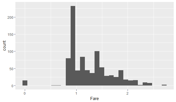 train$Title<- as.factor(train$Title)Second is the log transformation on Fare. Since I observed that the Fare variable plot is skewed, I simply took a log which reduced its skewness as well as variance, thus increasing accuracy.