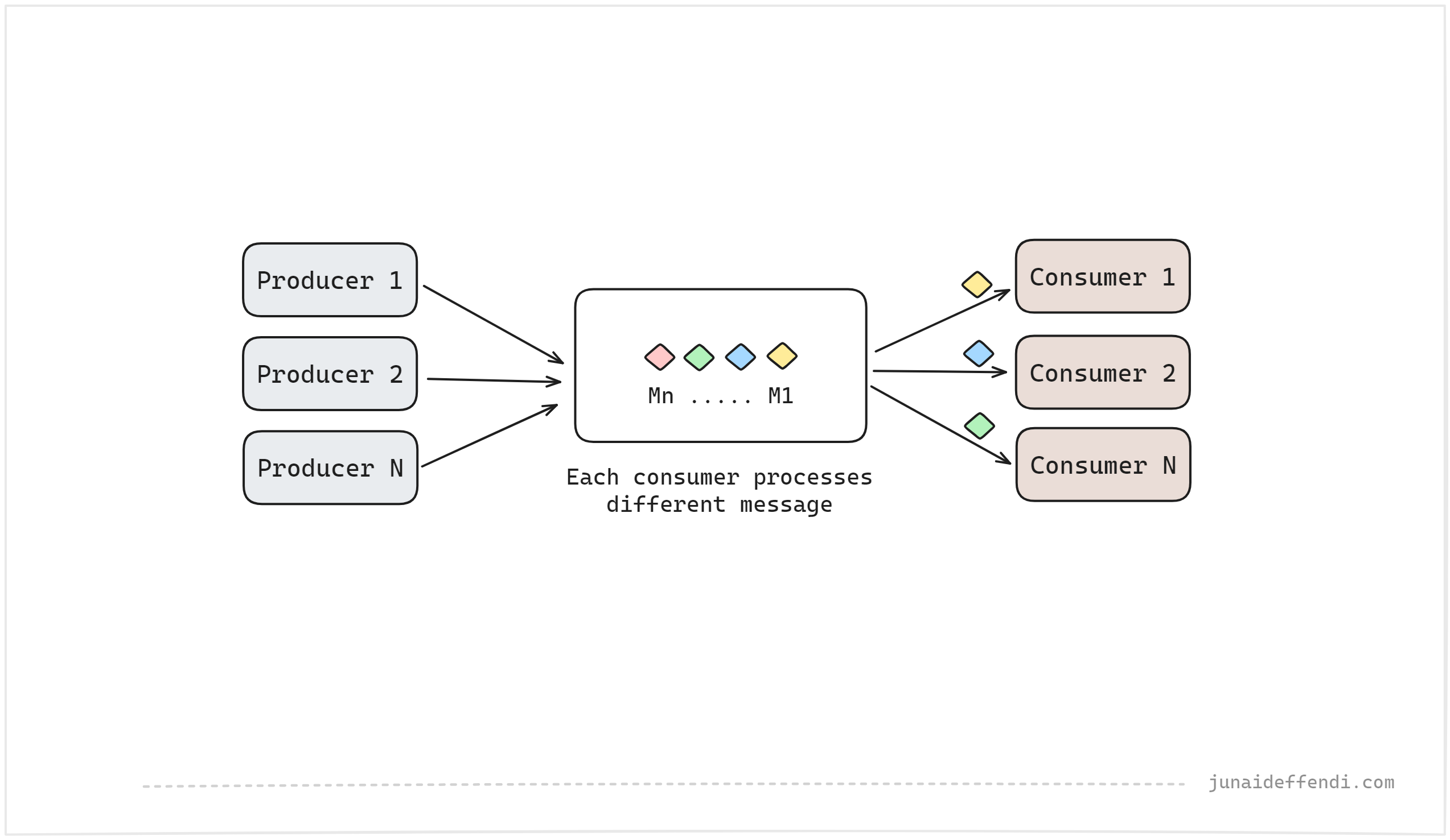 Multiple Producers can push to same Topic or Queue. Multiple consumers can read from same Queue.
