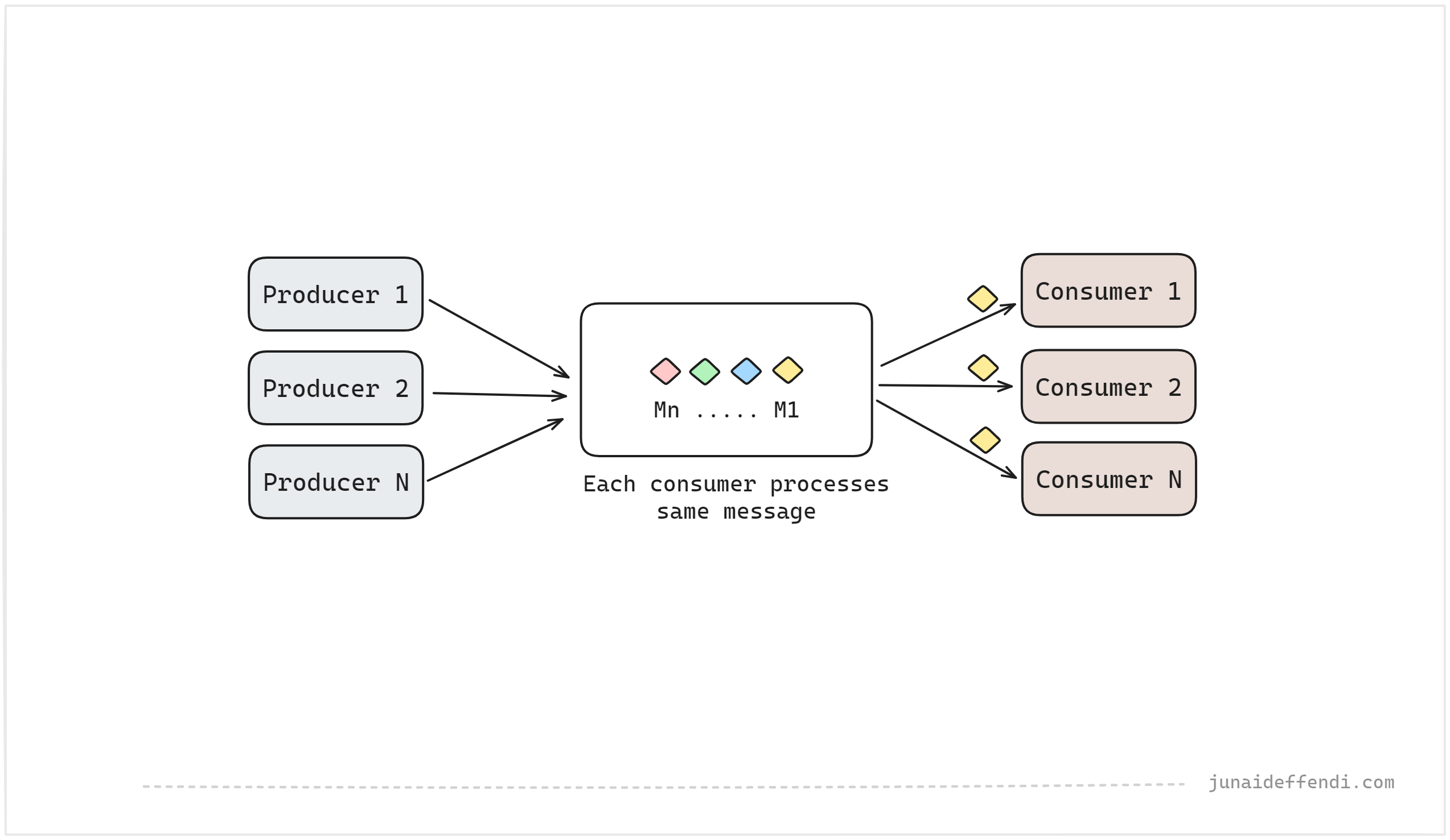 Multiple consumers cannot read the same message from the same queue as shown in image 1a, in order to support that usecase, multiple queues are required leading us to a PubSub solution as shown in the image 1b.
