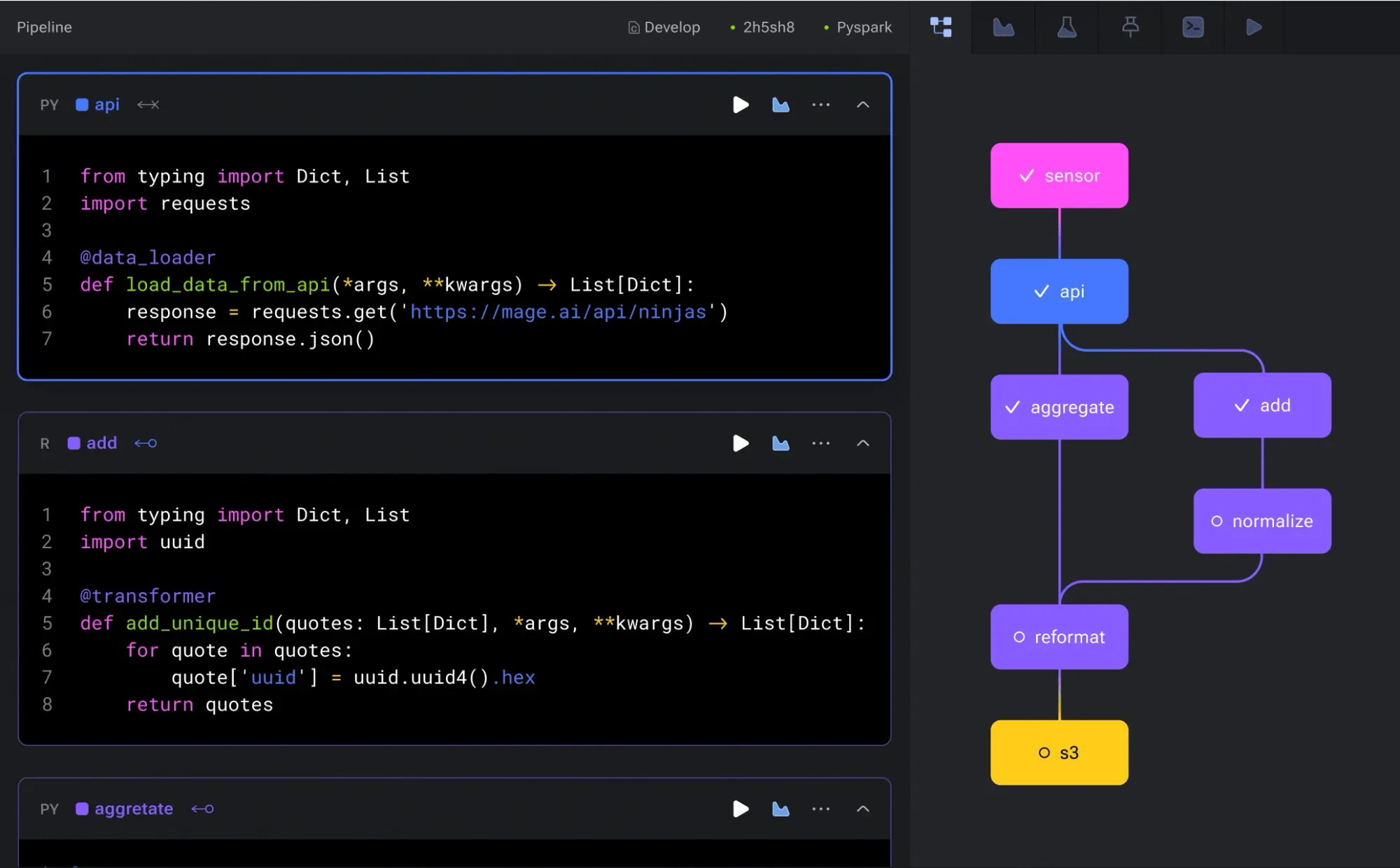 Think of Mage as Jupyter Notebooks where you can run the code piece by piece and get the results, meaning you can see the data and also visualize in the form of graphs and charts.