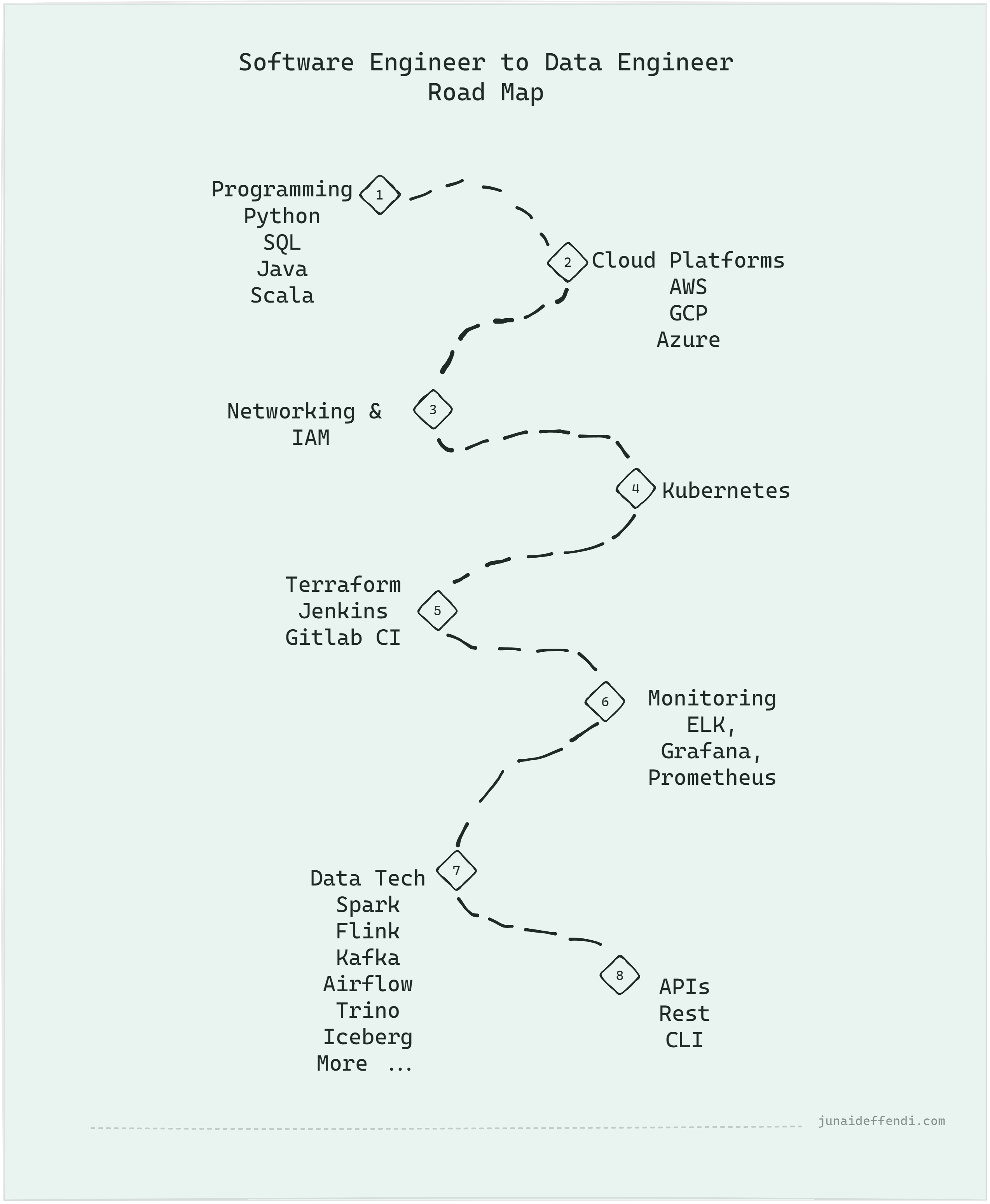💡Based on your experience you can easily plan and learn the most useful and missing components and go from there. E.g. if you are a Software Engineer with Infra experience, you can directly start at `7`.